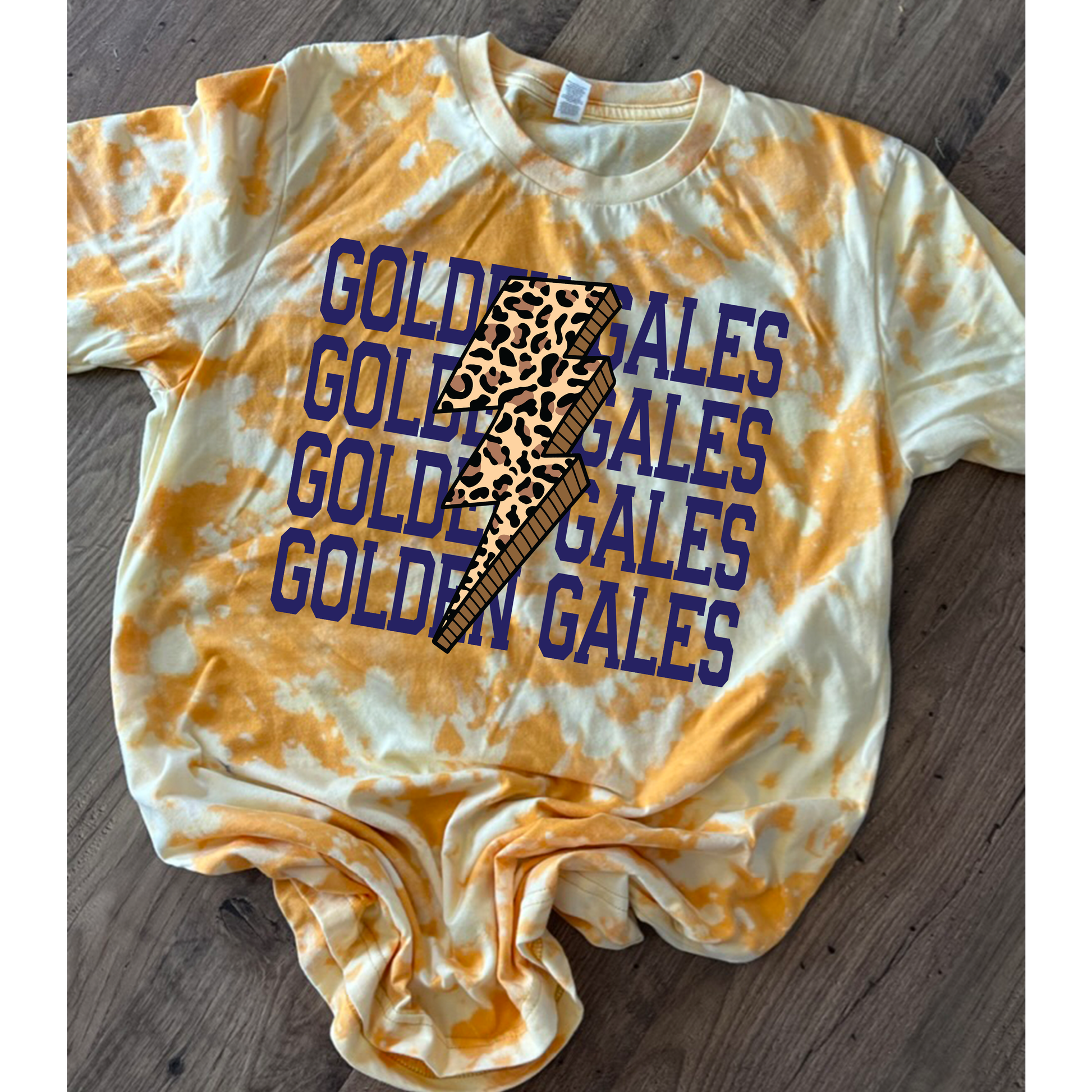 Spark spirit and style with our Golden Gales Lightning Tie-Dye Tee! Featuring a bold leopard lightning bolt and stacked “Golden Gales” text, this standout shirt delivers major attitude and comfort. Available in striking yellow or edgy navy scrunch tie-dye, it’s the perfect tee for showing off your Gales pride. Whether you're at the game or out on the town, this tee is guaranteed to turn heads. Sizes from Youth Small to Adult 3XL make it a versatile must-have for fans of all ages!