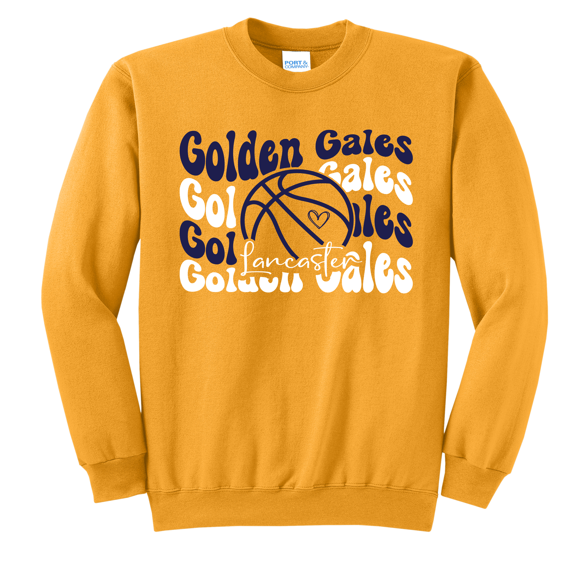 Show off your Lancaster pride with a vintage flair in this Golden Gales Retro Basketball Sweatshirt. Featuring playful, stacked “Golden Gales” text in navy and gold, a heart-outlined basketball, and a script “Lancaster” accent, this sweatshirt is a spirited nod to school pride with a trendy, throwback twist.
