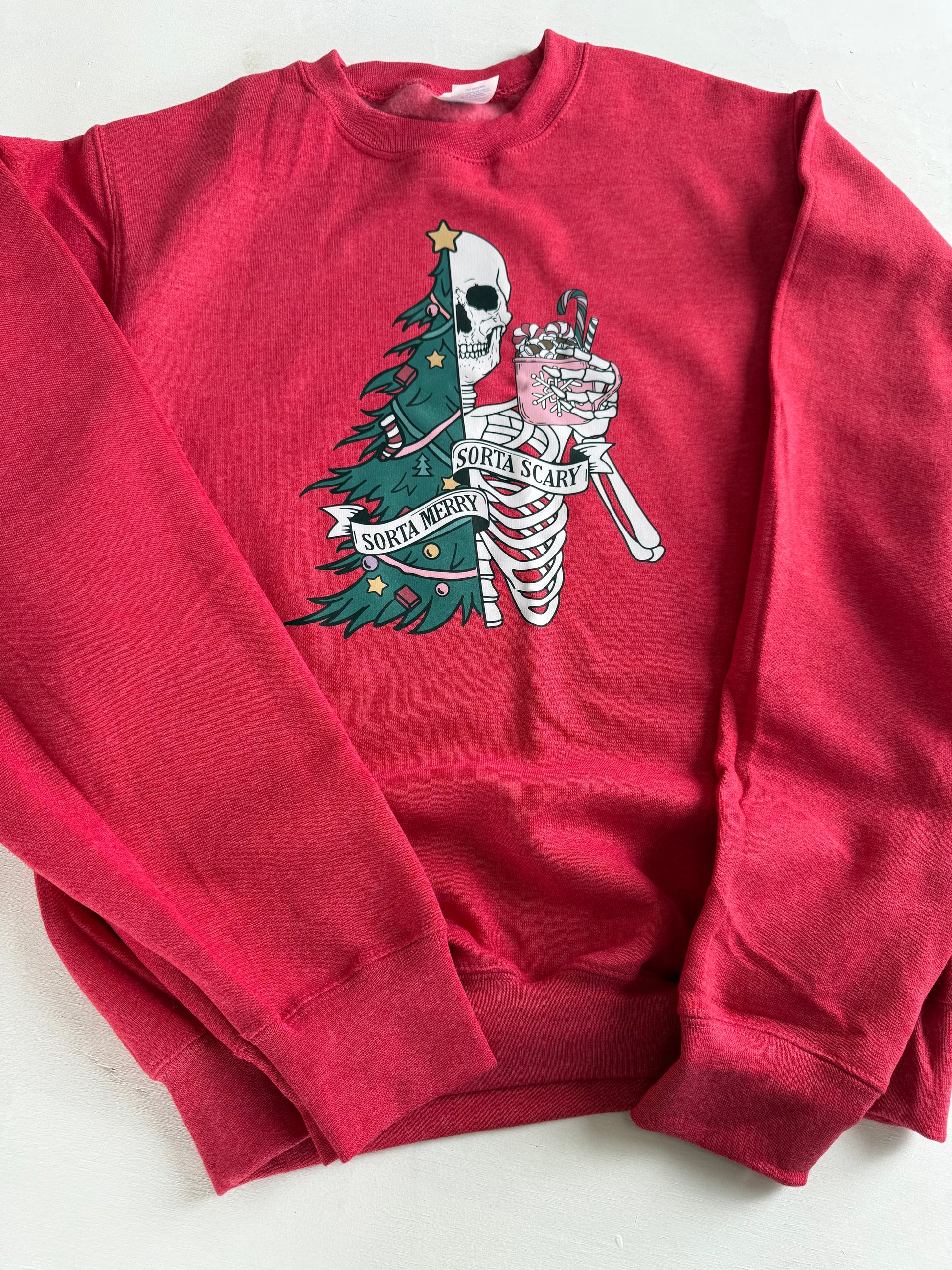 Vibrant red base color with a bold front graphic: tree + skeleton + “SORTA MERRY, SORTA SCARY” text